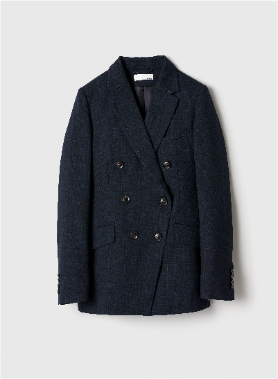 椿原:男っぽく羽織れるジャケットです。styling/の展示会で出会った、仕立てが端正なのに裾のボタンのつけ位置がサイドにあしらわれていて、ウエストがキュッとくびれるデザインのジャケット、素敵でした!カーディガン代わりに羽織ってもよさそう。