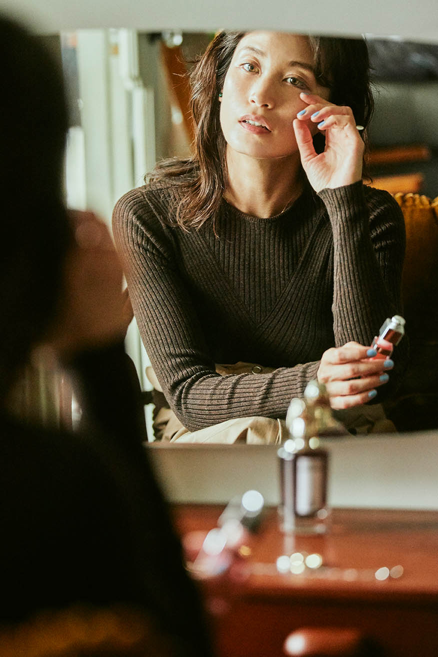 「朝、余裕がないとき。1着できまるアイテムがあると無敵になれませんか?リブニット×サファリスカートをドッキングさせたこのドレスは、上半身の編み地を巧みに切り替え細見え仕様に。ポイントはたくし上げたようなスカートのデザイン。自らアレンジを加えたような小粋さが、着こなしにリアリティもたせます」