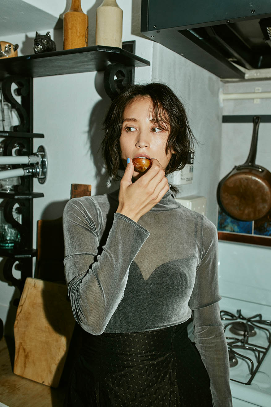 「リモートワークでも気分をあげたい。そんなときは少しフェミニンな格好で。シアー感のあるラメタートルなら、zoom会議でも顔周りがぱっと華やかに。光沢のあるジャカードスカートをセットすれば、そのままランチにも出かけられるはず。おなじみのアイテムも、キラッとした質感で遊ぶことで、着こなしに新鮮な余白が生まれます」